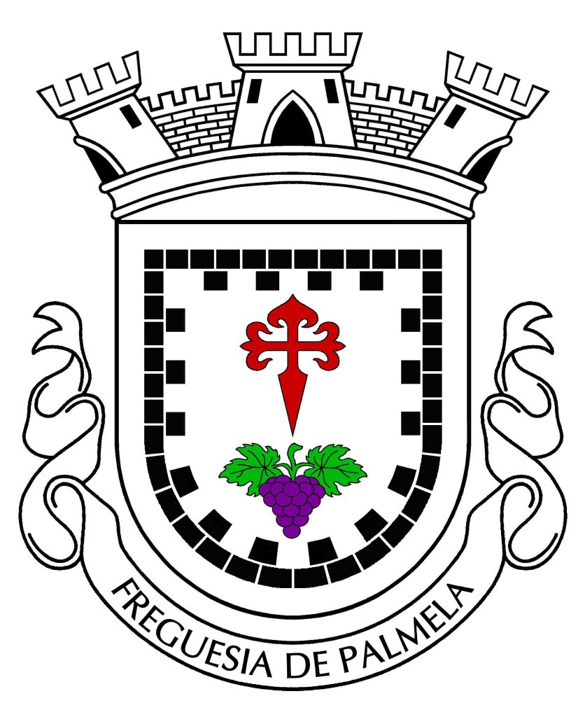 Escudo de prata, com uma cruz da Ordem de Santiago, de vermelho e um cacho de uvas de púrpura, folhado de verde, tudo alinhado em pala; orla ameiada de negro, lavrada do campo. Coroa mural de prata de três torres. Listel branco, com a legenda a negro: “FREGUESIA DE PALMELA”.