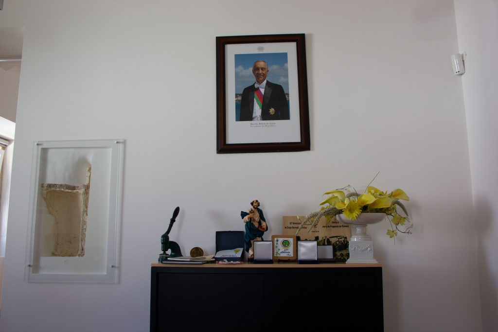 O cacho de uvas representa a produção dos famosos vinhos de Palmela.