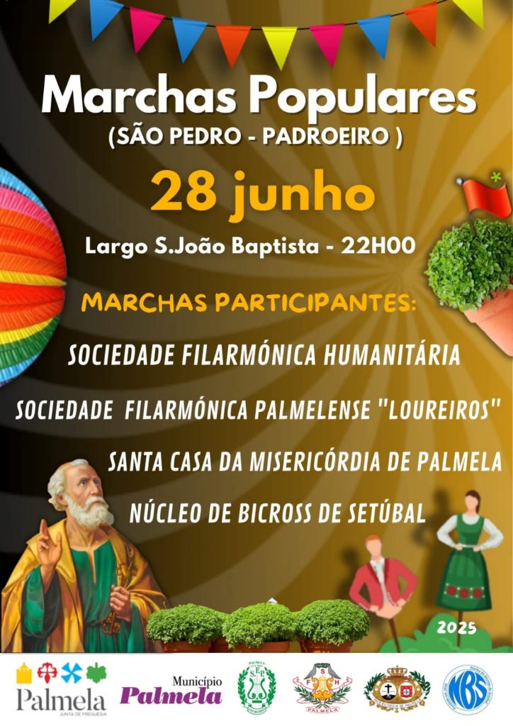 No dia 28 de junho, às 22h00, o Largo de São João Baptista recebe as tradicionais Marchas Populares, em honra de São Pedro, padroeiro da freguesia de Palmela.