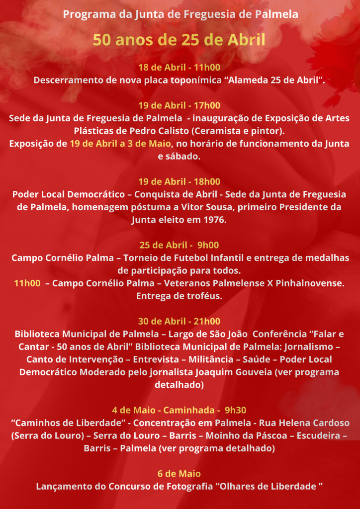 50 anos 25 de abril | Programa By admin|2024-03-27T10:00:17+00:00Março 27th, 2024|Freguesia| View Larger Image Share This Post With Others! FacebookTwitterLinkedInWhatsappGoogle+PinterestEmail Related Posts Procuramos calceteiro Gallery Procuramos calceteiro Outubro 2nd, 2025 | 0 Comments Palmela, terra de vinhos e tradição | 62º edição da Festa das Vindimas Gallery Palmela, terra de vinhos e tradição | 62º edição da Festa das Vindimas Agosto 26th, 2025 | 0 Comments Edital nº8 RE 20205 Gallery Edital nº8 RE 20205 Agosto 13th, 2025 | 0 Comments Marchas Populares celebram São Pedro em Palmela Gallery Marchas Populares celebram São Pedro em Palmela Junho 25th, 2025 | 0 Comments