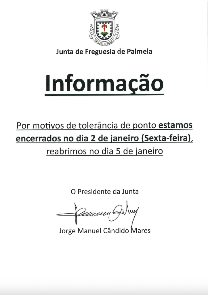 Tolerância de Ponto – 2 de Janeiro By admin|2026-01-02T10:01:04+00:00Dezembro 30th, 2025|Destaques, Freguesia, News| View Larger Image Share This Post With Others! FacebookTwitterLinkedInWhatsappGoogle+PinterestEmail Related Posts Benção das fogaças – 15 de Janeiro – 18 horas Gallery Benção das fogaças – 15 de Janeiro – 18 horas Janeiro 7th, 2026 | 0 Comments IV Concurso de Fotografia “Sítios e Recantos de Palmela” Gallery IV Concurso de Fotografia “Sítios e Recantos de Palmela” Janeiro 6th, 2026 | 0 Comments Neste Natal apoie os comerciantes da nossa Terra! Gallery Neste Natal apoie os comerciantes da nossa Terra! Dezembro 22nd, 2025 | 0 Comments Postal de Natal 2025 Gallery Postal de Natal 2025 Dezembro 22nd, 2025 | 0 Comments